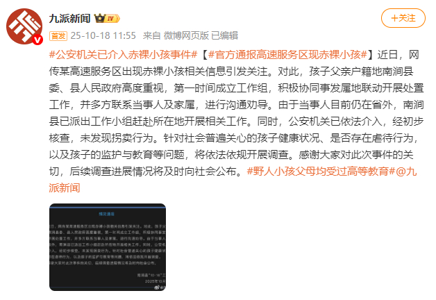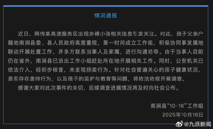 [官方通报高速服务区现赤裸小孩]近日,网传某高速服务区出现赤裸小孩相关信息引发关注。对此,孩子父亲户籍地南涧县委、县人民政府高度重视,第一时间成立工作组,积极协同事发属地联动开展处置工作,并多方联系当事人及家属,进行沟通劝导。由于当事人目前仍在省外,南涧县已派出工作小组赶赴所在地开展相关工作。同时,公安机关已依法介入,经初步核查,未发现拐卖行为。针对社会普遍关心的孩子健康状况、是否存在虐待行为,以及孩子的监护与教育等问题,将依法依规开展调查。感谢大家对此次事件的关切,后续调查进展情况将及时向社会公布。