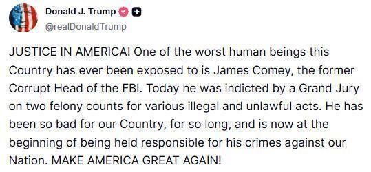 当天,特朗普借由社交媒体对这一消息表示“庆祝”,称科米“长期以来对美国非常坏”,现在“正义终于得到伸张”。就在数天前,特朗普还在社交媒体上发帖,抱怨司法部对科米的调查迟迟没有下文,要求尽快对科米提起诉讼。